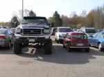 Since then I find it amusing to park next to larger vehicles in parking lots. Apparently other people find it so amusing that I found these pictures of my car floating around work via email one day after parking next to a truck. I know I'm not the only one, anyone else do this when there's no mini spots?