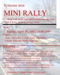 I'm Planning a Syracuse MINI Rally On April 29 at 10 AM at Marcellus County Park in Marcellus, NY where we'll "oohh" and "ahhh" at each other's MINIs for a bit. Then we'll head out for our Rally. We will be Motoring around the curvy scenic roads around Syracuse. Not a race, but just a chance to enjoy the coming of spring and meet the few Motorers in and around Syracuse. At the end of our rally we'll end up at Dinosaurs BBQ where who ever wants lunch can join in (everyone covers for themselves).